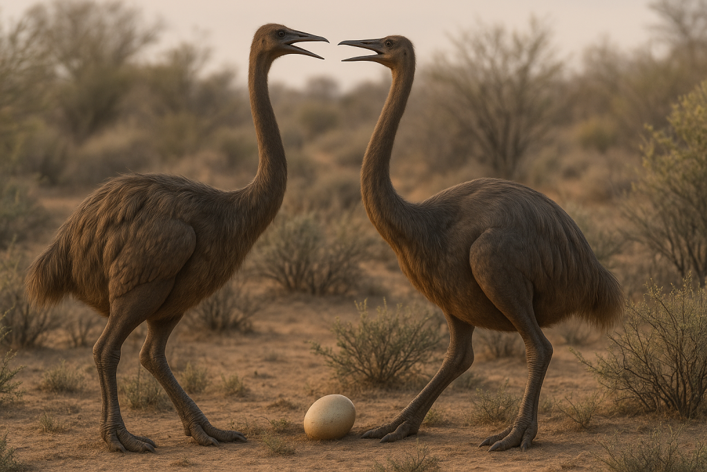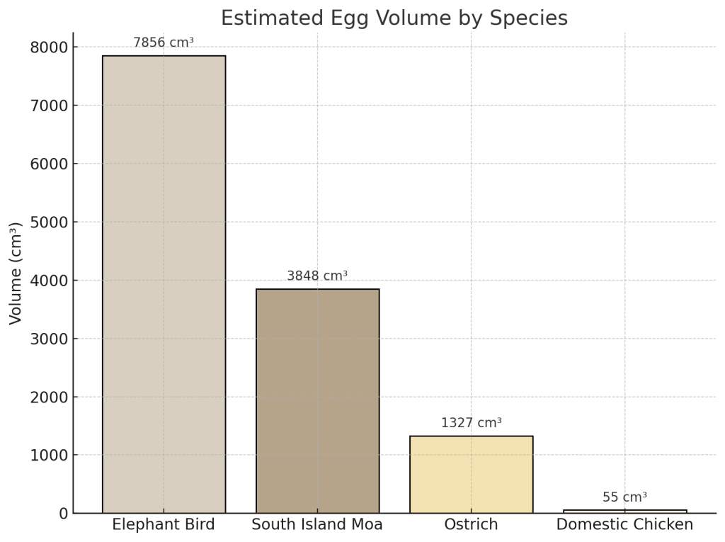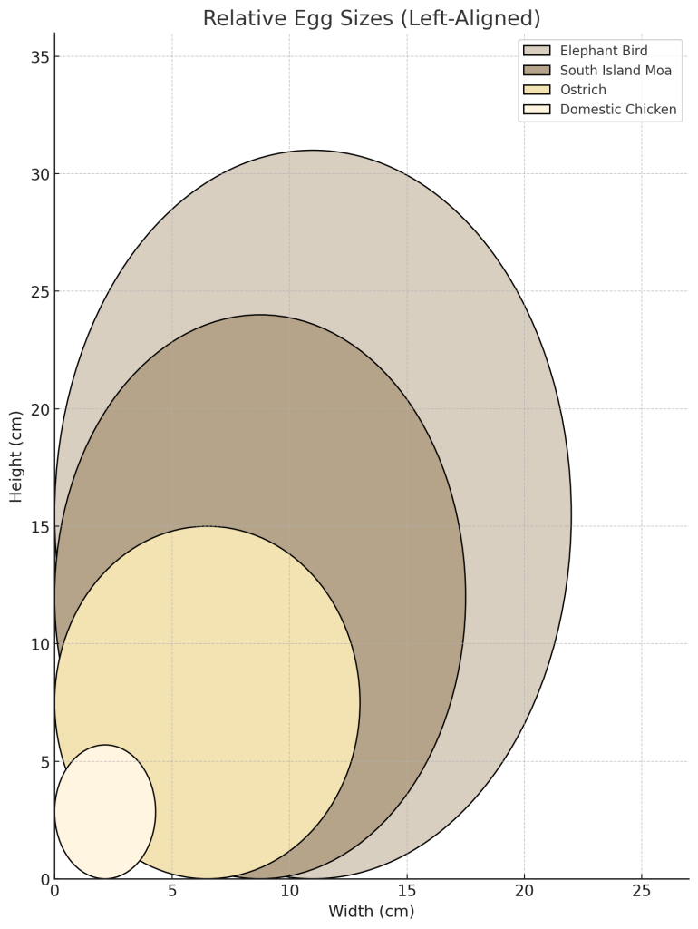 The elephant bird egg holds the record as the largest egg of any animal, and comparing it to other giant eggs highlights just how exceptional it is. If you lined up an ostrich egg next to an elephant bird egg, the ostrich egg would look like a little sibling, perhaps only one-fifth the mass of the elephant birds. Another extinct giant, New Zealand’s moa, also laid impressively large eggs. The South Island giant moa (Dinornis) stood over 3.5 meters tall, larger than an elephant bird in height, though more slender in build. Moa eggs reached about 24 cm in length. In volume and weight, the biggest moa eggs were roughly 2–3 liters. This is huge by normal standards, but still only perhaps one-third the volume of the largest Aepyornis eggs. Interestingly, moas had a peculiar reproductive twist. The largest moa species had relatively undersized eggshell thickness for the egg’s volume, suggesting the shells were somewhat fragile. It’s hypothesized moa eggs might have been incubated in moss or by males with minimal movement to avoid breakage. The elephant bird, by contrast, evolved a much thicker shell, possibly an adaptation to harsher, hotter conditions or to deter scavengers from breaking in.