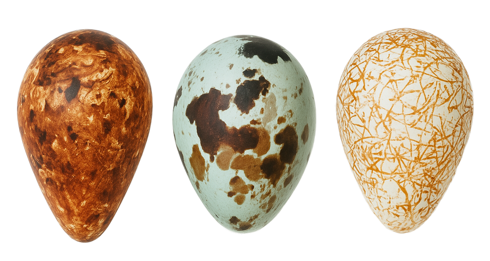 Protoporphyrin IX is the reddish-brown pigment that gives many bird eggs their browns, rusts, and speckles. Chemically, it’s a porphyrin, related to the heme molecule but without the iron. Birds deposit this pigment onto the outer layer of the eggshell, especially in the last hours before the egg is laid. This pigment produces earthy colors ranging from deep chocolate brown to brick red to pale tan or pinkish, depending on concentration and distribution. Protoporphyrin is often responsible for mottled patterns because it tends to be laid on in the shell gland as the egg rotates. It can form spots, speckles, or a blush of color on the otherwise white or blue shell surface. In effect, nature uses protoporphyrin as a brown “ink” or wash over the eggshell canvas.